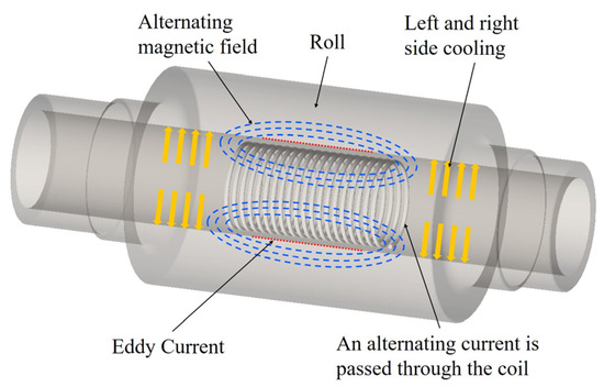 Electromagnetic control for roll profile is a technology based on the principle of electromagnetic induction, and the structure schematic diagram and the working principle are illustrated in Figure 1. The roll consists of a hollow sleeve and a central shaft, which are assembled via bearings. Induction coils are wound on the fixed central axis of the roll and connected to the external induction power supply. When the induction power supplies an alternating current to the induction coil, an alternating magnetic field is generated around it. Eddy currents are induced in the inner bore of the roll sleeve as it cuts the magnetic flux lines during rotation. As the generated eddy current flows against the resistivity of the roll, heat is generated by the principle of Joule heating.