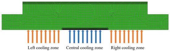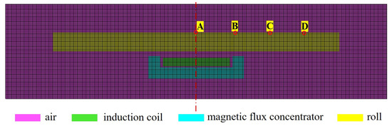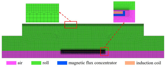 As the roll and the induction coil are geometrically axisymmetric, and the convective heat transfer boundary between the roll and cooling gas can be equivalently treated as an axisymmetric boundary [25], a simplified 2D axisymmetric electromagnetic–thermal–structural coupling finite element model is built in the soft-ware MARC, asshown in Figure 2. The roll dimensions are Φ850 × 1500 mm, and the specified internal control diameter is 180 mm. The heating section length is 500 mm. The model includes only the central through-hole air domain, neglecting the external air domain as it minimally affects the induction heating zones due to the roll’s large diameter.