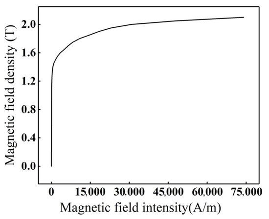 For medium-to-low induction heating, silicon steel laminations are typically chosen as the material for magnetic flux concentrators, attributed to their exceptional magnetic permeability, low core loss characteristics, saturation capability, and excellent thermal stability [26]. In the simulation, the resistivity of the silicon lamination is set to 4.5 × 10−5 Ω·m, and the B-H curve is shown in Figure 3. To maximize the magnetic flux concentrator’s performance, the silicon lamination should be maintained below the saturation induction point (Bs).