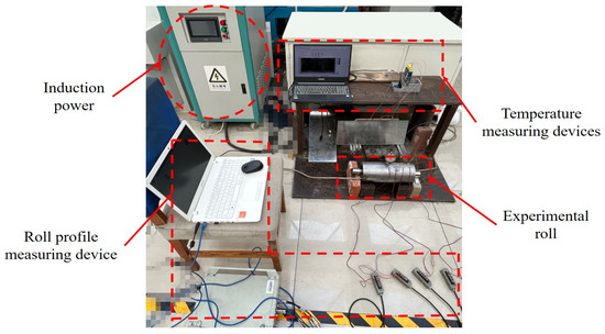 As shown in Figure 4, the experimental platform comprises four primary subsystems: the roll system, the variable-frequency power supply, the temperature measurement device, and the roll profile measurement device. The induction power supply operates at frequencies of 400–4000 Hz with a current capacity of 0–300 A and a maximum power output of 15 kW.