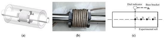 The roll surface temperature was measured using K-type surface-mounted thermocouples, which were connected to an NI temperature acquisition card for real-time monitoring via LabVIEW software-community edition. The roll profile was indirectly measured by real-time monitoring of circumferential strain using temperature-compensated strain gauges configured in a quarter-bridge circuit, which were connected to a dynamic testing and analysis system via a strain adapter. Four strain gauges were equally spaced from the roll’s midpoint to its edge, all aligned parallel to the cylindrical axis with matching circumferential orientation. Corresponding thermocouples were installed adjacent to each strain gauge at identical axial positions for synchronized temperature and strain measurements. A precision dial indicator was concurrently used to monitor the roll diameter variations for validation of the strain gauge measurements, and the schematic diagram is shown in Figure 5c. A, B, C, and D are the points corresponding to 0, 40, 80, and 120 mm away from the center of the roll.
