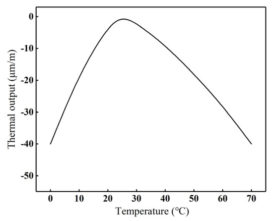 Due to nonlinear variations in the thermal expansion coefficient and resistance-temperature characteristics of the strain gauges, residual error compensation remains necessary. The thermal output (residual error) curve of these strain gauges is presented in Figure 6. These gauges demonstrate a parabolic thermal output profile, achieving optimal compensation at 25 °C while showing increased deviations at higher or lower temperatures. The radial deformation at each point of the roll surface is calculated by Equation (3), and the relationship between the radial change of the roll at different axial positions and the heating time is obtained to obtain the roll profile at any moment.