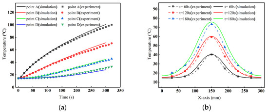 Figure 8a presents the experimental temperature–time curves for points A-D on the roll surface. After 300 s of heating, the points reached temperatures of 96.5 °C, 67.0 °C, 42.8 °C, and 31.1 °C, respectively. Corresponding simulation results showed temperatures of 100.7 °C, 71.3 °C, 44.7 °C, and 28.1 °C at these four points. The close agreement between experimental and simulated temperatures validates the model, with point D showing slightly moderate precision.