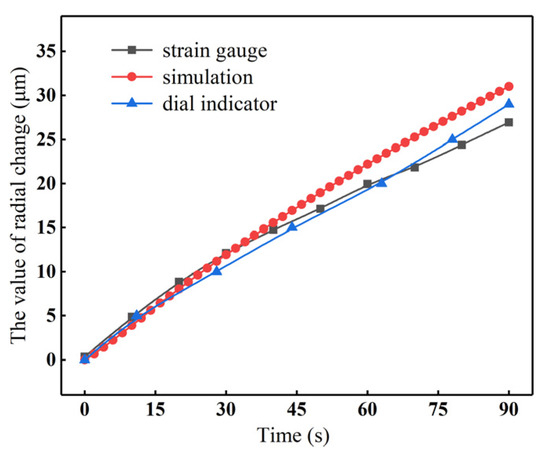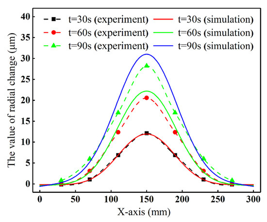 The radial change of the midpoint of the roll surface obtained from the dial indicator, strain gauge, and simulation is compared in Figure 9. The results show consistent deformation trends across all three methods. The simulation, based on theoretical calculations, yields higher values than the strain gauge and dial indicator measurements. The difference between the latter two is minimal, with minor deviations likely due to operational or reading errors. Figure 10 compares the experimental and simulated roll profiles at different moments. The results show that the accuracy is relatively high for the first 30 s; however, an increase in error is observed as time progresses. The simulated roll profile was 31 μm after being heated for 90 s, while the experimental result was 28.2 μm. The discrepancy between the two was less than 10%, confirming the simulation model’s high accuracy and consistency with experimental data.