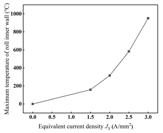Under the conditions of current frequency f = 1000 Hz and coil turn n = 50, four equivalent current densities Js = 1.5, 2, 2.5, and 3 A/mm2 were investigated. The roll deformation caused by thermal expansion was analyzed under a constant heating duration of 300 s. The simulation results are shown in Figure 11. It demonstrates that the maximum temperature of the roll’s inner wall increases nonlinearly with the rise in Js, and the rate of temperature increase also increases with Js. The maximum inner wall temperatures corresponding to Js = 1.5, 2, 2.5, and 3 A/mm2 reached 158.2 °C, 315.1 °C, 582.7 °C, and 950.8 °C, respectively. It implies that higher Js values produce both greater temperature magnitudes and faster heating rates.