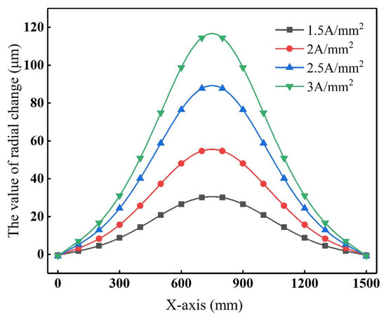Figure 12 shows the roll profile curves under different equivalent current densities at t = 300 s. Due to internal induction heating applied to the central region of the roll, the deformation speed at the midpoint of the roll surface is the highest, while the edge of the roll surface remains unchanged during the heating. An increase in Js leads to a corresponding increase in the roll crown.