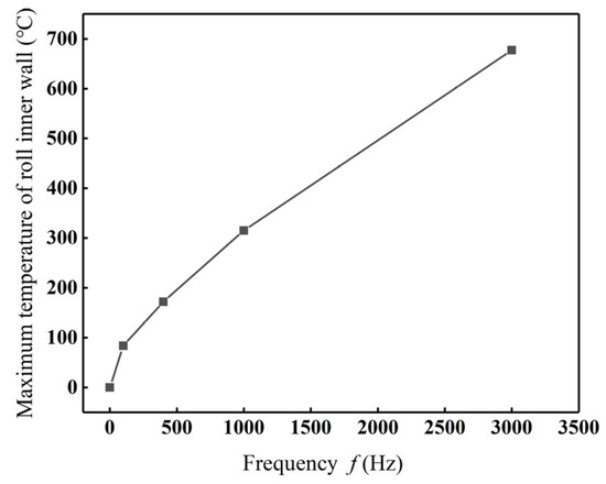 Maximum temperature of the inner wall of the roll at different frequencies (t = 300 s).