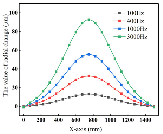 Under the equivalent current density Js = 2 A/mm2, coil turn n = 50, and the heat time t = 300 s, the maximum temperature of the roll inner bore and the roll profile corresponding to f = 100, 400, 1000, and 3000 Hz are shown in Figure 13 and Figure 14. It can be seen that the temperature rises with the increasing frequency. The maximum temperature of the roll inner bore reaches 83.8 °C, 172 °C, 315 °C, 677 °C, and the radial changes of the midpoint of the roll surface are 13.2 μm, 32.5 μm, 55.5 μm, and 92.6 μm, respectively. Increased frequency leads to greater convexity in the roll profile curves for the same heating time.