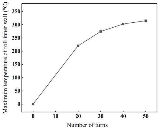Maximum temperature of the inner wall of the roll at different numbers of turns (t = 300 s).