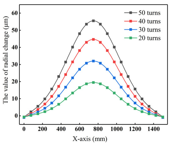 When the equivalent current density Js is set to 2 A/mm2, the frequency f = 1000 Hz, and the heat time t = 300 s, the maximum temperature of roll inner bore and the roll profile corresponding to the coil turn n = 20, 30, 40, and 50 are shown in Figure 15 and Figure 16. Figure 15 shows that the maximum temperature of the roll inner bore rises with the increasing coil turns due to intensified magnetic field intensity and improved heating efficiency. However, the maximum temperature change rate declines with the growth of the coil turns. The reason is that when Js and f remain constant, increasing the coil turn simultaneously raises the coil impedance, leading to greater voltage drop and energy consumption. This combined effect results in a slower maximum temperature rise rate of the roll. The roll crown increases with the number of coil turns, showing values of 19.5 μm, 32.0 μm, 44.7 μm, and 55.5 μm, respectively, as illustrated in Figure 16.