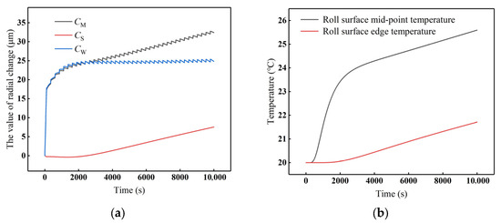 Roll profile curve and roll surface temperature distribution at different times after cooling control is applied: (a) Roll profile curve, (b) Roll surface temperature distribution.