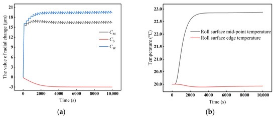 Roll surface deformation and temperature after applying cooling control: (a) Deformation, (b) Temperature.
