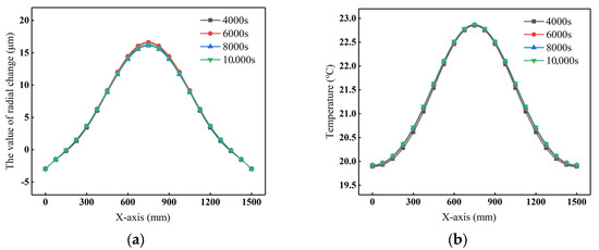 To satisfy both roll profile control requirements for electrode calendering and production cleanliness standards, an internal gas cooling was selected for segmented roll cooling, as shown in Figure 18. The roll inner bore is divided into three cooling segments: the left side of the cooling zone, the right side of the cooling zone, and the central cooling zone. Through iterative simulation and adjustments, 20 °C gas cooling with a convective heat transfer coefficient of 200 W/(m2·K) was applied to the inner hole of the roll, while 15 °C gas cooling with a convective heat transfer coefficient of 300 W/(m2·K) was applied to both sides of the inner hole, resulting a stable roll profile at duty 1/50. As shown in Figure 19, the roll profile stabilizes at approximately 3000 s and maintains stability through subsequent periodic heating. Figure 20 demonstrates the roll profile curve, and the roll surface temperature remains stable at 4000 s, 6000 s, 8000 s, and 10,000 s, confirming that periodic heating is an effective method for roll profile stabilization.