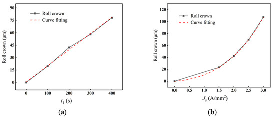 Keeping the equivalent current density Js fixed at 2.0 A/mm2, t1 was set to 100 s, 200 s, 300 s, and 400 s, respectively, and the stable roll crowns under different t1 were obtained by adjusting the duty cycle and cooling conditions. The stabilized roll crowns are shown in Figure 21a. The stabilized roll crowns corresponding to different t1 are 19.6 μm, 42.2 μm, 58.1 μm, and 78.1 μm, respectively, showing a linear relationship with t1. The first heating time t1 = 200 s, and Js were set to 1.5, 2, 2.5, and 3 A/mm2, the stabilized roll crowns shown in Figure 21b were 23.2 μm, 42.2 μm, 69.6 μm, and 107.4 μm, demonstrating a nonlinear relationship with Js.
