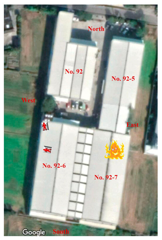 This paper is a case study of a factory fire at 01:53 a.m. on 03 October 2019 in Daya District, Taichung City, Taiwan. According to the official fire investigation report, the fire started on the northeast side of No. 92-7 and was caused by an electrical malfunction. Throughout the response operation, six to eight hose lines were aimed at the north and west sides of No. 92-7. At first, the fire did not reach No. 92-6, and there was approximately an 8 m wide passage between Nos. 92-7 and 92-6 (see Figure 1). To assess the condition of No. 92-6, the site commander assigned two firefighters to enter the building via the second floor and conduct ambient temperature measurements using an infrared camera. Shortly after the two firefighters entered, a full-scale fire broke out at No. 92-6, resulting in the death of the two firefighters. The exact cause of the firefighters’ deaths has yet to be determined, as this incident has anomalies that make it uniquely dissimilar to previous cases. To determine what occurred, the official fire investigation report and the firefighters’ autopsies were sequestered, and the research team visited the fire site to gather information regarding the building construction materials for Nos. 92 and 92-5, both of which were unaffected by the fire. Interviews with the factory owners and employees were also conducted to bring together all the possible data on the matter, including the precise building dimensions, structure type, internal combustibles, and their stacking situation. This was combined with information regarding the number of window openings as well as their size and location.