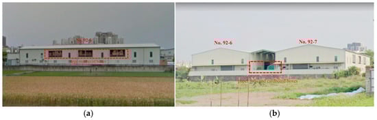 A Google map image of the west side of No. 92-6, captured prior to the fire, shows a large number of boxes and other items stacked on the second floor, as illustrated in the red dotted box in Figure 3a. A second Google map image of the south side of Nos. 92-6 and 92-7 shows the two buildings separated by a passage approximately 8 m wide, and a triangular roof above the passage with the highest point about 7.4 m from the ground (Figure 3b). At the time of the fire, there was a large pile of items, including paper rolls and cardboard boxes, at the bottom of the central passage towards the south side. The stack shown is 4 m high with a width of approximately 2 m and is situated in the center of the passage. This position allowed for the movement of people and vehicles on either side and is marked by the dashed box in Figure 3b.