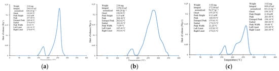 DSC test results for the three sample types at a heating rate of 1.0 °C min−1: (a) paper lunch boxes, (b) tissue paper, and (c) corrugated boxes.