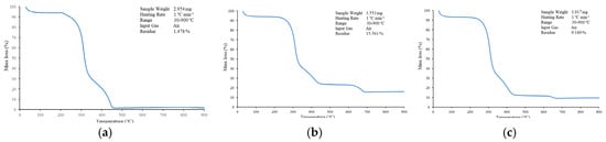 TG test results for the three sample types at a heating rate of 1.0 °C min−1: (a) paper lunch boxes, (b) tissue paper, and (c) corrugated boxes.