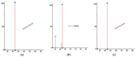 The three sample types were also subjected to TGA analysis; burning gas was captured at 250 °C and analyzed using the GC-MS, and these results are presented in Figure 6. Analysis of these results shows that the dominant gas emitted was carbon dioxide (CO2) but also that the tissue paper contained more fluoroethyne (C2HF) than the other samples. The remaining gases, in smaller proportions, were carbonic acid (H₂CO₃), carbonic anhydride, and acetylene (C2H2).