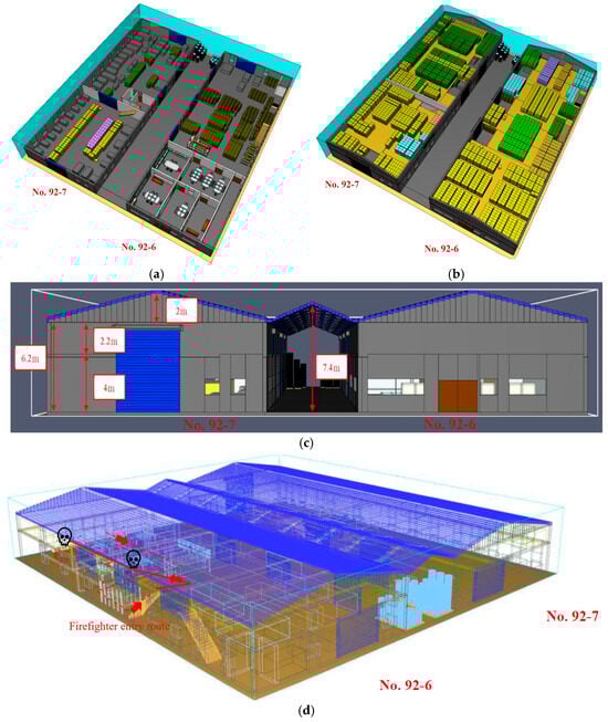 The front half of the first floor of No. 92-7 housed production machinery and the front half of the first floor of No. 92-6 was office space. The remainder of the building was filled with a large supply of paper goods and functioned as a factory and warehouse. The stored goods primarily consisted of corrugated boxes, paper cups, paper lunch boxes, tissue paper, and disposable tableware. The products were a mix of finished and semi-finished goods, most of which were combustible, as shown in Figure 2c. Because of the large supply of paper-based products and the large number of items stored, most of the items and materials were packed in corrugated cardboard boxes. 100 × 100 × 10 cm3 pallets were also stored on top of each other in the warehouse. The internal stacking height limit for the items was approximately 180 cm, and the storage state of the stacked items was exceptionally dense, as illustrated in Figure 2d.