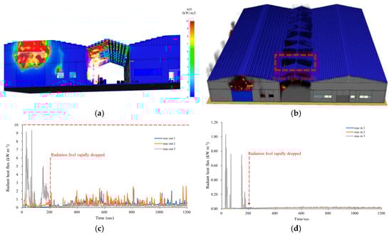 Typical paths of fire spread included ember exposure, radiation, and flame contact [30]. In this situation, the plant was an enclosed space, which makes ember exposure exceedingly unlikely. This study investigated whether the radiant heat flux from the fire at No. 92-7 could have been transmitted to No. 92-6 across the 8 m wide passage, igniting the combustible materials on the other side. As shown in Figure 7a,b, when No. 92-7 was fully burning at 02:41 a.m., the radiant heat passed through the roof of the middle passage towards No. 92-6. However, as shown in Figure 7c,d, the thermal radiation at each of the three measurement sensors outside and inside No. 92-6 was below 10 kW m−2, which would have been insufficient to ignite the combustible materials in No. 92-6 [31,32].
