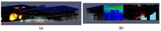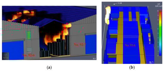 It was observed that when No. 92-7 was fully ablaze at 02:41 a.m., after approximately 9 s, a stream of fire and smoke escaped from the window on the south side of No. 92-7. Approximately 30 s later, an extremely large fire plume, followed by smoke, spread to the pile of paper rolls on the south side of the building. The boundary condition used in the simulation adopted the built-in FDS parameter “OPEN”, allowing airflow exchange with the atmosphere, without specifically setting wind velocity. By 100 s into the simulation, the paper roll pile was in full flame and building in intensity. This made it likely that the fire would spread to No. 92-6, as demonstrated in Figure 9a. Approximately 967 s into the simulation, the paper rolls on the south side of No. 92-6 ignited (Figure 9b). This indicated that the fire in No. 92-7 spread to No. 92-6 by flame extension via the paper roll pile.