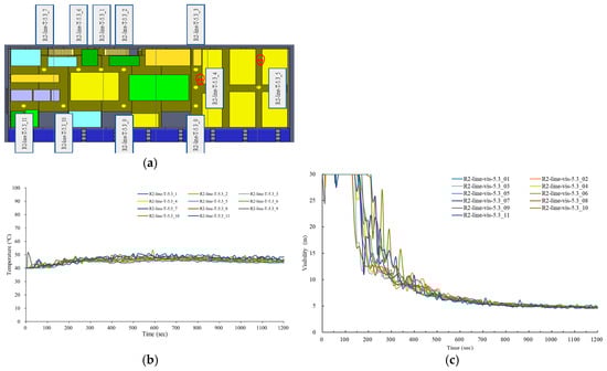 The simulation start time was 02:41 a.m. During the simulation period of 1200 s, the internal heat radiation level of No. 92-6 did not meet the standard requirements for ignition of the combustible materials that were present. A noticeable amount of smoke and combustible gases from the fire at No. 92-7 penetrated the second floor of No. 92-6 through the intermediate passage (Figure 10a,b). During this simulation period, the 11 sensors shown in Figure 11a that were positioned 1.5 m above the surface of the walkway on the second floor of No. 92-6 showed temperatures between 40 and 50 °C (Figure 11b). The temperature at the highest location on the second floor was only ca. 65 °C (Figure 10b). Around 180 s into the simulation, the visibility of the 11 measurement sensors at No. 92-6 dropped to 10 m, one after the other. After approximately 720 s, the visibility had dropped to roughly 5 m (Figure 11c).