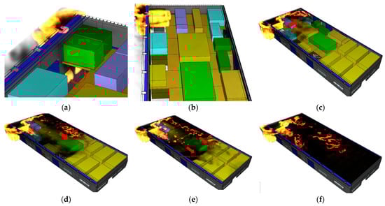 Computer simulation results of the direction of fire expansion on the second floor at No. 92-6: (a) simulation start time 02:57 a.m., (b) simulation run time 107 s, (c) simulation run time 110 s, (d) simulation run time 118 s, (e) simulation run time 126 s, and (f) simulation run time 134 s.