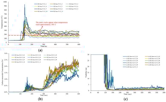 When the two firefighters entered the second floor of No. 92-6 to carry out their situational assessment duties, they would have been at or near the walkway of the second floor of No. 92-6. To test this in the simulation, 11 detection sensors were placed 1.5 m above the walkway, as shown in Figure 11a. When the pile of paper rolls outside the south side of No. 92-6 ignited (around 02:57 a.m.), a separate simulation was run, lasting 600 s (10 min) until 03:07 a.m. Between 100 and 200 s, the temperature of the 11 detection points above the surface of the second-floor walkway rose sharply. The maximum temperature was approximately 920 °C (Figure 13a). The floor temperature near the staircase leading down to the ground floor reached around 510 °C. In addition, the CO concentration at the detection point exhibited a constant increase, as shown in Figure 12b. The maximum concentration was around 3%. By 120 s into the simulation, visibility at the detection points dropped close to 0 m, as illustrated in Figure 12c. By this point, it had reached the fourth-level heat resistance limit for firefighters in fire conditions, as defined by the NIST classification [33]. Since the SCBA mask is the most vulnerable part of all firefighter protective equipment, firefighters had less than one minute of heat endurance, resulting in difficulty for the two firefighters to escape successfully.