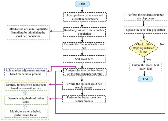 Finally, we implement a stagnation response mechanism: If no better solution is found after SC consecutive iterations, the algorithm temporarily increases the proportion of random scout bees while reducing the number of optimal and better scout bees from the current iteration. The adjustment follows Equations (12) and (13):