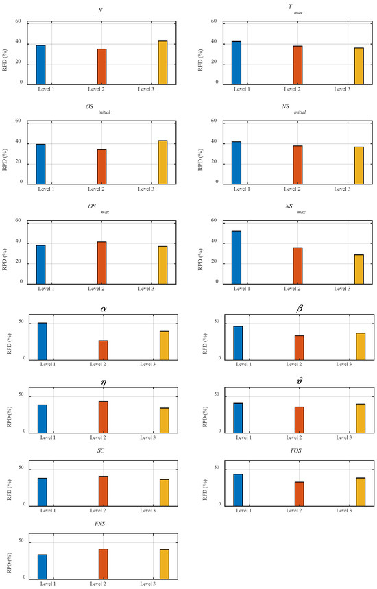 Afterward, we determine the IBA parameter configuration by calculating the average RPD for each value of each parameter set, as shown in Figure 3. The lower the average RPD, the better the algorithm performance under that parameter level.