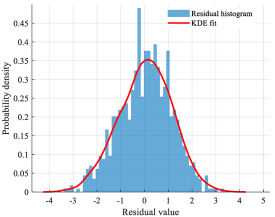As can be seen from the results, except for a few points located outside the interval [−3, 3], the majority of residuals are distributed within [−3, 3]. Furthermore, the KDE-fitted residual probability density curve appears smooth and nearly symmetric about = 0, suggesting the distribution can be reasonably approximated as normal.