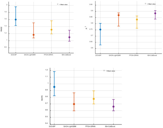 To evaluate the effectiveness of IBA-CatBoost, we conduct a comparative analysis with SAOA-LightGBM [4], FFOA-GRNN [35], and DCS-BP [22] based on the case study presented in Section 4. The evaluation employs three key metrics: RMSE, R2, and MAPE. All algorithms are configured according to their respective literature recommendations. For each experimental run, the training and test sets are randomly partitioned. Ten independent repeated trials are conducted, with results averaged to mitigate random variability and ensure reliability. The comprehensive comparison is presented in Table 4, while Figure 8 illustrates the statistical outcomes.
