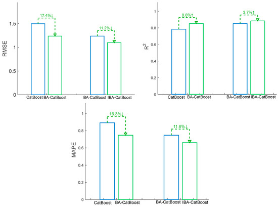 To systematically evaluate the optimization effect of the IBA on the CatBoost model, we conduct a comprehensive comparative analysis among three algorithmic variants: (1) the baseline CatBoost, (2) BA-CatBoost, and (3) IBA-CatBoost. Each algorithm configuration undergoes ten independent runs to ensure statistical reliability, with performance metrics calculated as mean values. The detailed comparative results are presented in Table 5 and visualized in Figure 9.