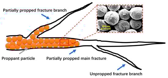 Figure 1. Schematic diagram of a partially propped fracture network (half-fractured network, modified from Oraki Kohshour et al. [23]).