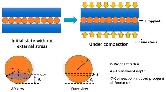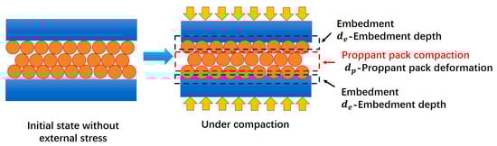 After a hydraulic fracturing operation, the fracture pressure drops rapidly due to fluid leakage [24]. Under a certain amount of closure stress, both proppant embedment and proppant pack compaction lead to fracture width reduction. Proppant embedment is particularly noticeable in fractures in weakly consolidated coal, sandstone, and shale rocks [14]. Assuming that proppants are evenly distributed and are in contact with each other under the single-layer proppant placement condition (see Figure 2), the propped fracture width change is due to proppant embedment and proppant particle deformation [20]. The proppant embedment depth is expressed as [22]