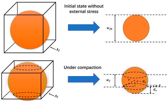 In Equation (16), w f is already known. If the dynamic value of ϕ p is obtained, one can calculate k p and hence k f . As shown in Figure 6, for the single-layer proppant placement condition, the initial porosity and the porosity under compaction are expressed as follows (the proppant deformation δ is negligible compared with the embedment depth):