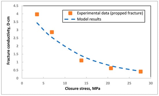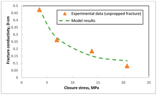 The proposed fracture conductivity models for propped and unpropped fracture segments were verified against experimental data. Unpropped and propped fracture conductivity measurement experiments were performed by Zhang et al. [33]. Barnett Shale samples were placed in an API conductivity cell during the experiments. Note that the experimental apparatus was more representative of controlled laboratory conditions. Dry nitrogen gas was injected as the flowing fluid. The unpropped shale fractures contained anhydrite, while the propped shale fractures were filled with multi-layer 100-mesh proppants. The closure stress could be approximated as the effective stress under a relatively low gas pressure. The input parameters are listed in Table 1. These values are reasonable compared with those reported in the literature [10,22,25,34]. As shown in Figure 8 and Figure 9, good agreement between the laboratory observations and calculation results was achieved, indicating that the proposed conductivity model could describe the dynamic conductivity of both propped and unpropped fractures. In Figure 8, the average error between the four data points and our calculation results is shown to be 5.8%, while the average error in Figure 9 is 8.1%. The conductivity values of both unpropped fractures and propped fractures dropped with an increase in the closure stress. Specifically, the unpropped fracture conductivity was always lower than the propped fracture conductivity, but the overall decline rate was similar for both. For the hydraulic conductivity, the unit was a combination of the permeability’s unit (Darcy) and the fracture width’s unit (cm). Regarding the propped fracture, its conductivity decreased from 4 D·cm to 0.42 D·cm as the closure stress changed from 3.5 MPa to 27.6 MPa. Regarding the unpropped fracture, the conductivity dropped from 0.47 D·cm to 0.08 D·cm with a closure stress rising from 3.5 MPa to 20.7 MPa.