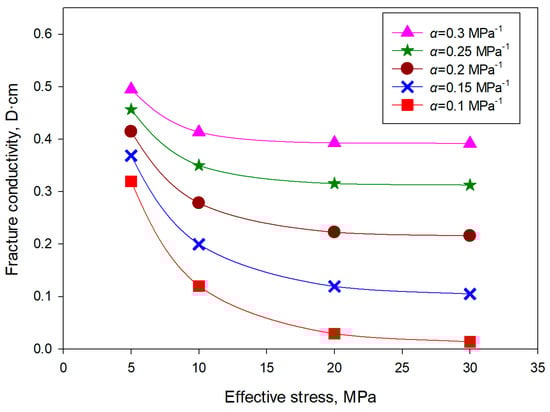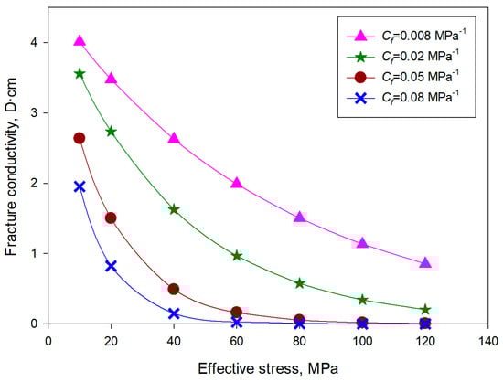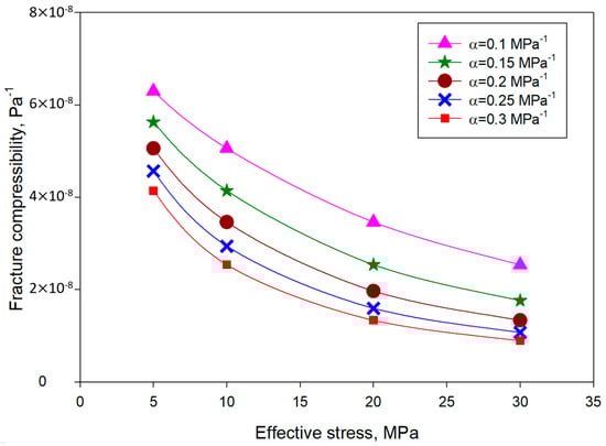 For unpropped fractures, the compressibility is a key factor influencing fracture conductivity variation [36]. Unpropped fractures’ compressibility normally exhibits stress-dependent features [29]. The rate at which the compressibility decreased was used to describe the variation in the fracture compressibility under different stress conditions. In this paper, this parameter was set in the range from 0.1 MPa−1 to 0.3 MPa−1 [25]. The other parameters were the same as in the model validation case. As shown in Figure 11, under the same effective stress conditions, the conductivity decreased with a reduction in the rate at which the compressibility decreased. This was because a lower rate of decrease led to larger compressibility under identical stress conditions (see Figure 12), indicating that the fracture was more compressible. Thus, the conductivity was more sensitive to the effective stress. At a low effective stress, the difference in the fracture conductivity was relatively small. This difference was enhanced with increasing effective stress (see Figure 11). With the same compressibility reduction rate, higher effective stress induced lower fracture compressibility. The compressibility reduction rate determined the unpropped fracture’s compressibility under a certain stress state. Increasing the compressibility reduction rate made the conductivity–stress curve move down.