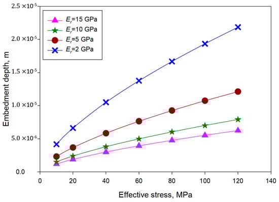 Figure 14. Impacts of the fracture surface elastic modulus ( E r ) on the proppant embedment depth for single-layer propped fractures.