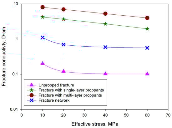 Tight, unconventional reservoirs normally require massive hydraulic fracturing to create high-conductivity fractures or fracture networks and facilitate hydrocarbon extraction. Hydraulic fracturing has become a “game-changer” for unconventional oil and gas resource development [1]. During hydraulic fracturing, proppants are injected to prevent fracture closure and maintain the fracture conductivity under compressive stresses [1]. The created fractures serve as conductive pathways for oil and gas to flow from the reservoir to the wellbore [2]. In proppant injection processes, it is almost impossible to prop the entire fracture domain due to proppant settlement [3]. As a result, the effectively propped fracture length is smaller than the created fracture length. In terms of fracture networks with fracture branches, it is difficult for proppants to enter the fracture branches, depending on the angles between the main fracture and fracture branches [4]. The ease of fluid flow in propped and unpropped fractures is crucial for the well production process [2]. The fluid–rock reaction during fracture propagation and proppant transport will influence the proppant placement pattern [5,6], resulting in three types of fracture segments: multi-layer propped, single-layer propped, and unpropped fracture segments. The above-mentioned fracture segment conductivity plays a pivotal role in the stimulation efficiency of hydraulic fracturing because it is directly linked to the well deliverability [7]. The changes in the fracture conductivity due to stress variations control the long-term well productivity [8].