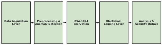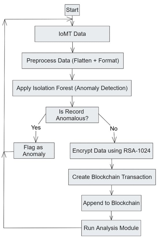 The framework’s design is based on a layered architecture: data collection and preprocessing happen at the IoT layer, followed by anomaly detection, secure storage, and data governance using blockchain. The design is specific to each module yet complementary, addressing the requirements of an IoT-enabled healthcare system. Figure 4 depicts the overall flow of the framework, highlighting the primary decision points, anomaly detection, encryption, and logging activities on the blockchain.