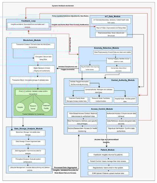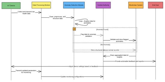 However, these are connected through a dynamic feedback mechanism that periodically recalibrates and optimizes system performance. It shows the proposed framework being modular. Herein, the data flow between IoT devices, anomaly detection, blockchain storage, access control, and dynamic feedback loop, which ensures continuous optimization, is highlighted. The process starts from the IoT Data Module and proceeds with data collection, preprocessing, and sending it to the Anomaly Detection Module for evaluation. The Central Authority Module validates flagged anomalies, and the Blockchain Module encrypts and stores normal data flows. In the Data Storage and Analysis Module, verified data are stored and analyzed, creating insight for stakeholders to utilize and inform predictive analytics. Alerts and updates are flowing dynamically across modules. For instance, anomaly alerts generate responses from healthcare professionals, and system performance metrics generate updates in system policies in the feedback loop. With the Patient Module, insights are shared with patients, closing the loop and guaranteeing that all stakeholders are updated. The proposed flow is further illustrated in Figure 3.