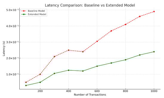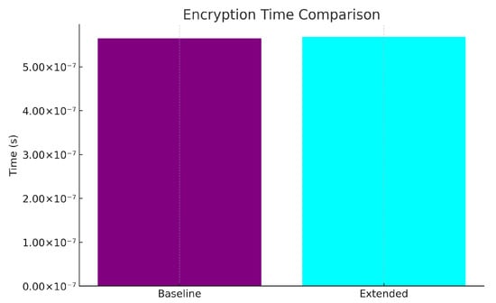The analytic evaluation of encryption time between the baseline model and extended framework measured the proposed security improvements in processing efficiency. As shown in Figure 7, the encryption times for both models are nearly identical, demonstrating that the extended framework’s enhanced security features do not impose significant additional computational overhead.