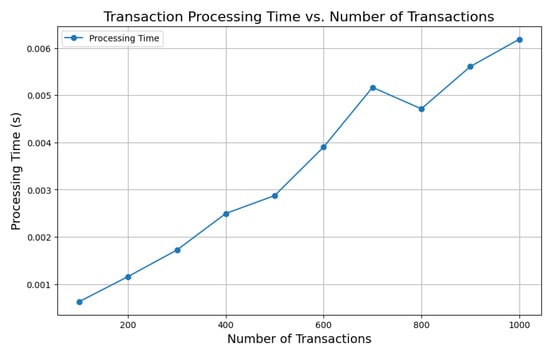 Through analysis of transaction processing time against transaction volume, we evaluated the operational effectiveness and scalability of our proposed blockchain-based IoT framework. As demonstrated in Figure 8, the processing time follows a linear growth trajectory, scaling proportionally with the transaction volume. At 200 transactions, the processing time is recorded at approximately 0.001 s, increasing to 0.006 s at 1000 transactions, representing a six-fold rise across this range. The framework demonstrates an efficient, predictable scalability profile, which makes it ideal for real-time IoT healthcare applications that require dependable processing. The design choices and architectural decisions explain why processing time shows linear growth. Transaction batching, a fundamental design choice, diminishes blockchain block creation overhead so the system can handle increased transaction volume without complication. The security solution combines efficient RSA encryptions with digital signatures to provide strong protection while remaining economically feasible. The system distributes computational tasks to various nodes through its modular framework structure, which helps prevent slowdowns during growth.