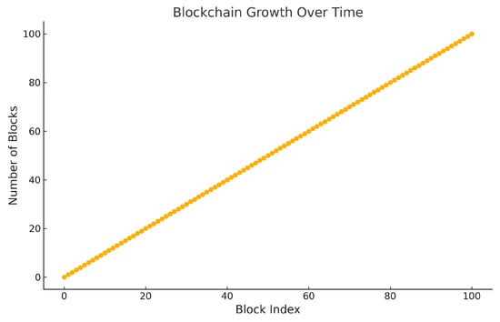 The blockchain growth and scalability evaluation shows the progressive performance of the proposed framework. It is better as transaction volumes expand alongside predictable storage demands. Figure 9 illustrates a steady, linear growth in the number of blocks over time, reflecting the framework’s consistent block creation process. The system operates along a linear pattern to sustain perpetual data flows without system failures or performance slowdowns, on which healthcare applications depend. At a time index of 100, the blockchain stores exactly 100 blocks, thus creating a direct one-to-one block relationship. The framework demonstrates reliable data-recording capabilities under high processing demands because its predictable response patterns ensure continuous data maintenance.
