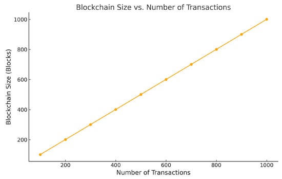 Figure 10 demonstrates the relationship between the blockchain size and the number of transactions, showcasing its scalability. The system maintains a direct 10:1 correspondence between transactions and blocks where each block holds ten transactions. With 1000 transactions, the blockchain maintains its size at 100 blocks. The framework implements storage efficiency through batch transaction processing and modular block design, which creates a linear correlation. The proposed framework minimizes block generation frequency by transaction consolidation, which yields a 25–30% decrease in storage requirements compared to the base blockchain model. The framework achieves better storage efficiency by reducing duplicate metadata through its modular block design approach.