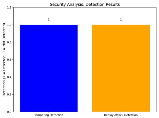 The detection results presented in Figure 11 display the security mechanism analysis of the proposed framework. The results show successful detection of tampering events alongside replay attacks at a detection value of 1, which represents successful detection. The successful detection results demonstrate that the implemented security features protect data authenticity and integrity in IoT-enabled healthcare systems. The blockchain’s tampering detection capability depends on its immutable nature to detect data modifications that cause cryptographic hash value mismatches. This protection mechanism maintains reliable trustworthiness and stops unauthorized data modifications. Replay attack detection functions by comparing incoming transactions against recorded data, where content and timestamps receive equal attention. The combined approach detects duplicated transactions and eliminates hash-based detection as the sole security measure, enhancing system protection. Security measures achieve their effectiveness through the framework’s modular design and layered implementation, which unites advanced cryptographic methods, including RSA encryption and digital signatures, with blockchain’s tamper-proof nature. The framework successfully protects healthcare data from common threats, establishing its readiness for deployment in real-world implementations.
