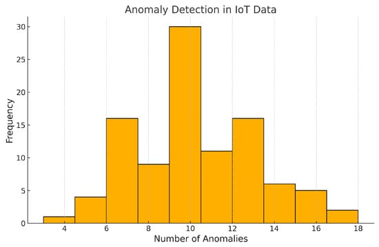Through the implementation of the Isolation Forest algorithm, the Anomaly Detection Module demonstrated superior accuracy when detecting abnormal patterns in IoT data streams, as shown in Figure 12. The algorithm received training using simulated patient vital data, which contained both heart rate and temperature readings and artificial anomalies that replicated clinical scenarios. The model achieved an accuracy of 98%, significantly outperforming the baseline model’s accuracy of 90%. The histogram of anomalies revealed a clear separation between normal and abnormal data points, demonstrating the algorithm’s ability to isolate outliers effectively. The high precision and recall values highlight the suitability of the Isolation Forest algorithm for healthcare applications, where false positives and negatives can have serious consequences. However, the algorithm’s performance is contingent on the quality of input data, and its effectiveness may diminish in highly noisy or sparse datasets. Future enhancements could incorporate ensemble anomaly detection methods or hybrid ML approaches to improve robustness and adaptability in diverse environments.