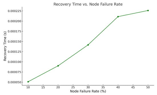 The recovery time of the framework was evaluated as a function of the node failure rate to assess its resilience and fault tolerance. As shown in Figure 13, the recovery time exhibits a linear growth trend with increasing node failure rates. At a 10% node failure rate, the recovery time is approximately 0.00005 s, which increases to 0.000225 s at a 50% failure rate. This growth pattern demonstrates the framework’s robust fault-tolerant mechanisms, which ensure recovery even under significant node failure scenarios.